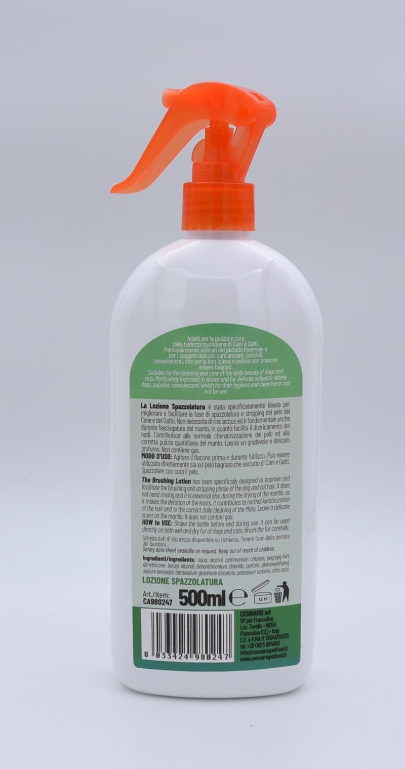 The Brushing Lotion has been specifically designed to improve and facilitate the brushing and stripping phase of the dog and cat hair. It does not need rinsing and it is essential also during the drying of the mantle, as it makes the detation of the knots. It contributes to normal keratinization of the hair and to the correct daily cleaning of the Mato. Leave a delicate scent on the mantle. It does not contain gas.