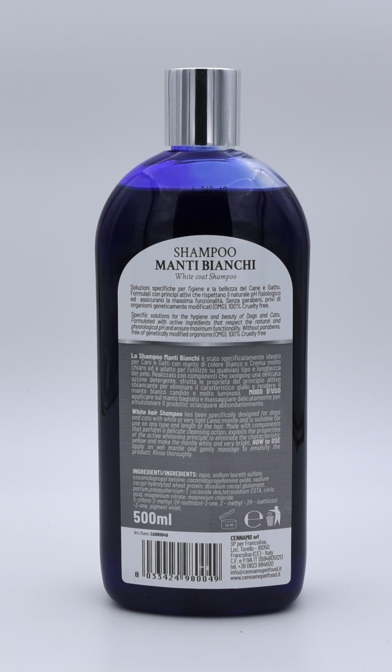 White hair Shampoo has been specifically designed for dogs and cats with white or very light Cema mantle and is suitable for use on any