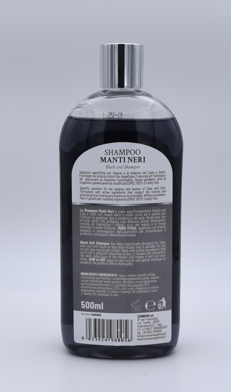 Lo Shampoo Manti Neri è stato specificatamente ideato per Cani e Gatti con manto Nero o molto scuro ed è adatto